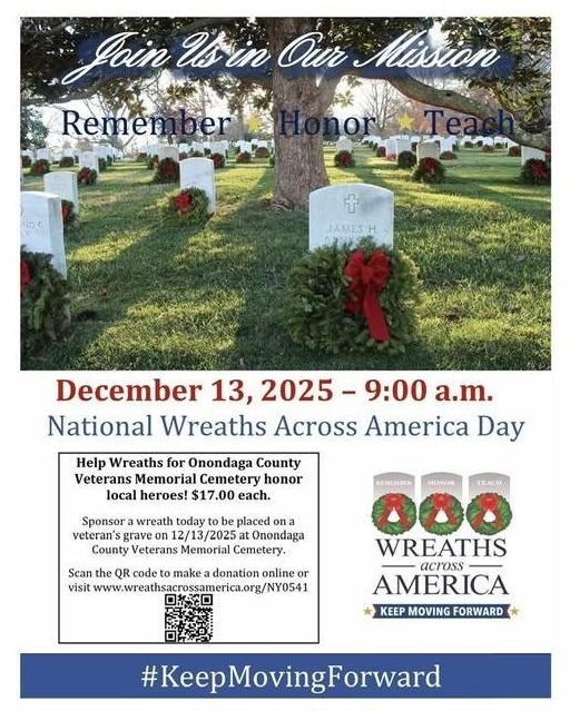 Local Wreaths Across America Event Planned for December 13, 2025, at 9 a.m. Onondaga County Veterans Memorial Cemetery 4069 Howlett Hill Road, Syracuse, NY 13215